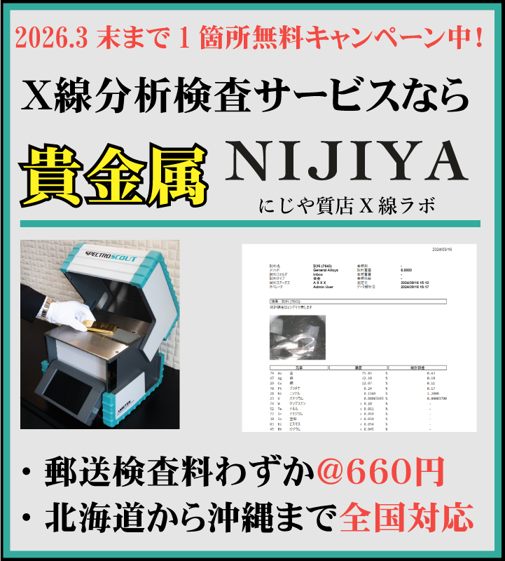 そこでにじや質店では、全国郵送対応・低価格で利用できるX線分析サービスを専門サイト「にじや質店X線ラボ」として展開し、より多くのお客様に分析サービスをご提供しています。